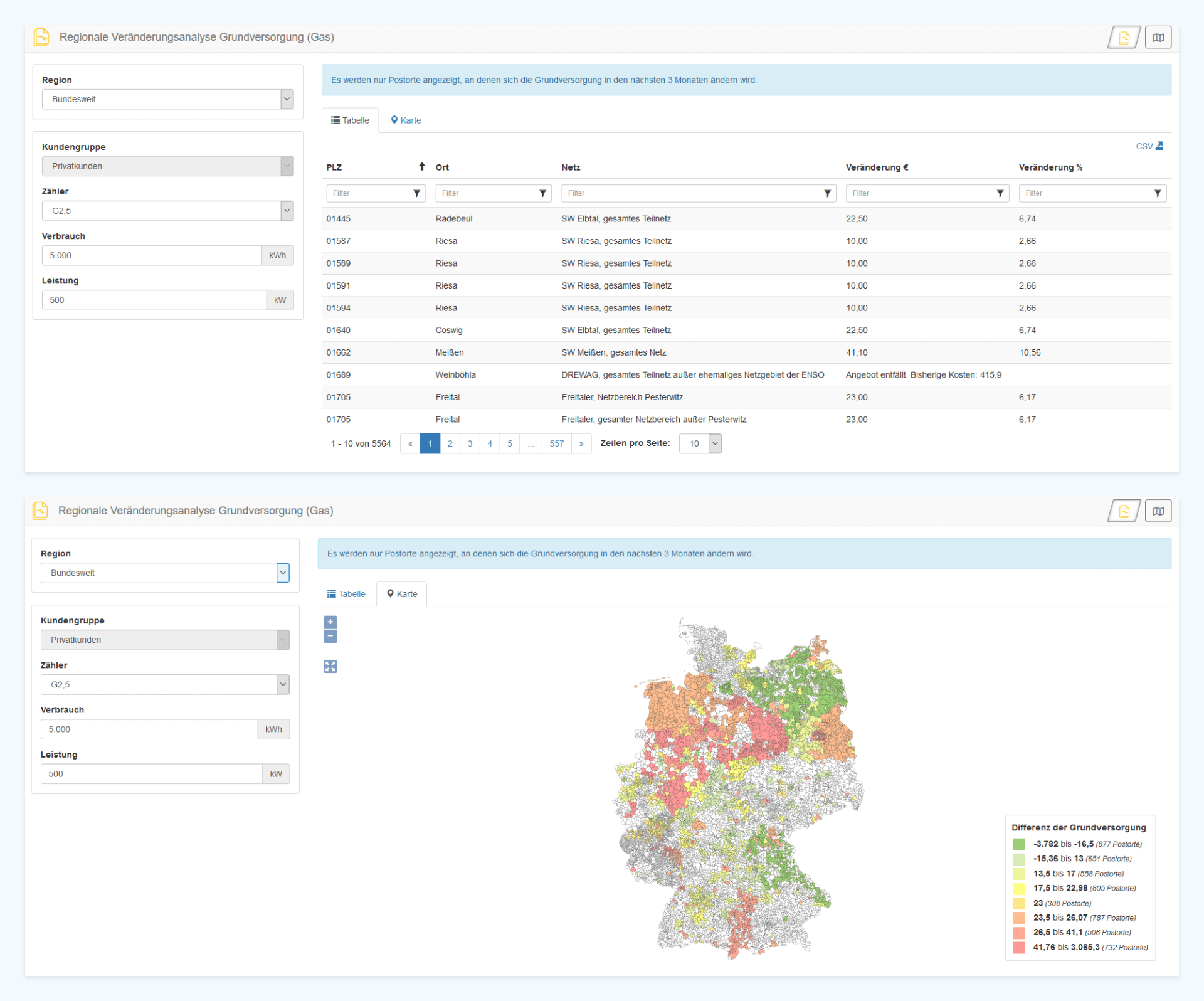 Nach der Berechnung zeigt Ihnen die App die Veränderung der Grundversorgungskosten in Euro und Prozent in Tabellenform auf Ortsebene an. Zusätzlich besteht die Möglichkeit, in die Kartenansicht zu wechseln. Dort wird die Kostendifferenz, die sich aus der Veränderung der Grundversorgungstarife ergibt, anhand farbiger Markierungen auf einer Deutschlandkarte dargestellt. Dadurch erhalten Sie einen noch besseren Überblick über die regionalen Veränderungen.