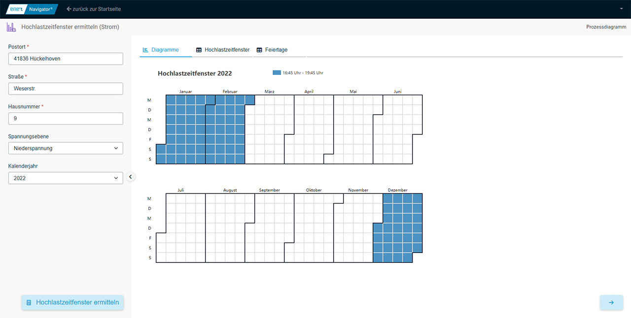 Die App Hochlastzeitfenster ermitteln (Strom) auf dem ene't Navigator® dient der Ermittlung der Hochlastzeitfenster eines Netzbetreibers. Die Bestimmung des Netzbetreibers erfolgt dabei über die Adresse der Lieferstelle. Durch Übergabe der Spannungsebene und des Betrachtungsjahres werden die für die Abnahmestelle relevanten Zeitfenster ermittelt.