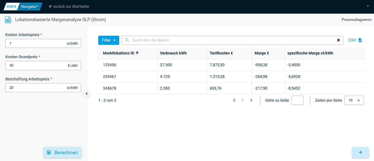 Als Teil des Prozesses Preisanpassung Bestandskunden SLP (Strom) und des gleichnamigen Prozesses Lokationsbasierte Margenanalyse (Strom) auf dem ene't Navigator® unterstützt Sie unsere App Lokationsbasierte Margenanalyse (Strom) dabei, lokations- und verbrauchsscharf und somit auch kundenbezogen, Ihre Margen zu analysieren sowie als objektive Grundlage des Prozesses Preisanpassung Bestandskunden SLP (Strom) auch dabei, eine Entscheidung zu treffen, bei welchen Kunden eine Preisanpassung erforderlich ist und bei welchen Kunden darauf verzichtet werden kann.