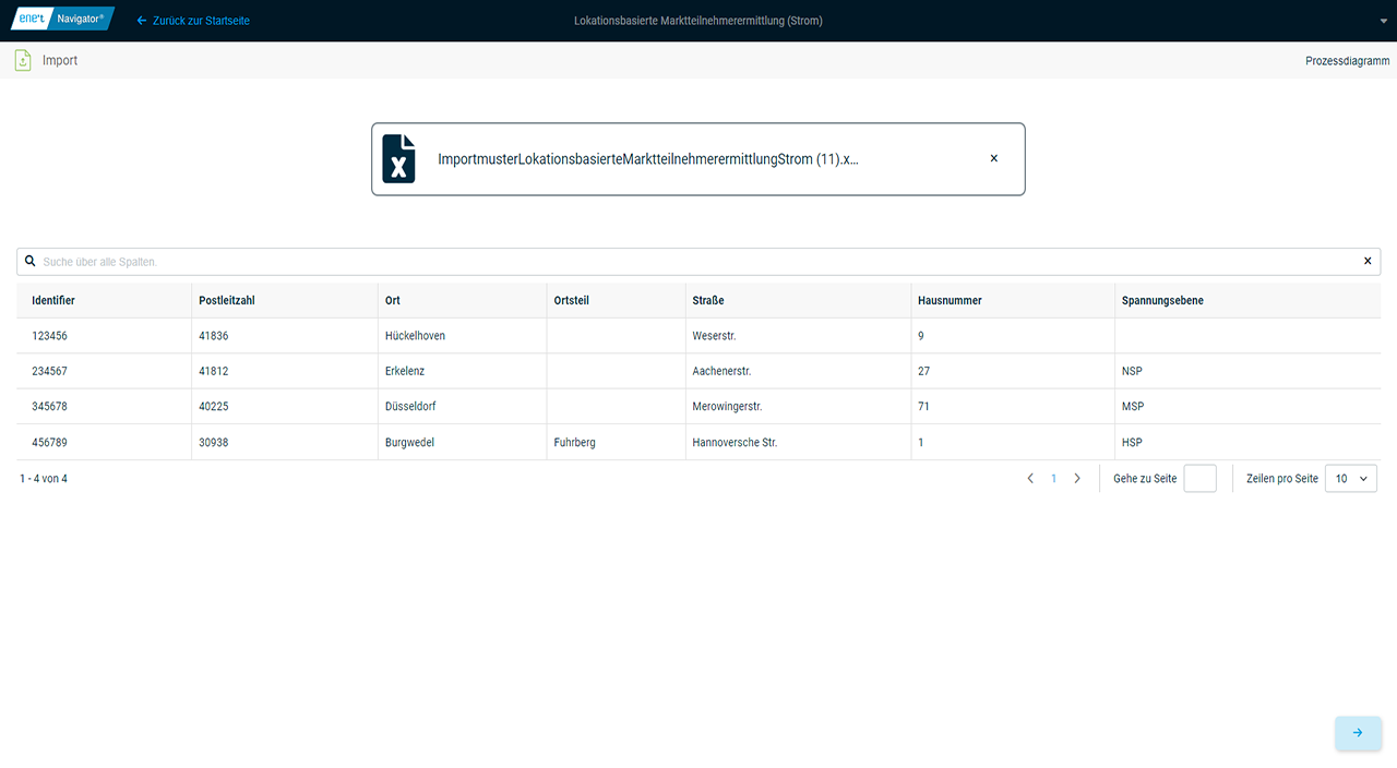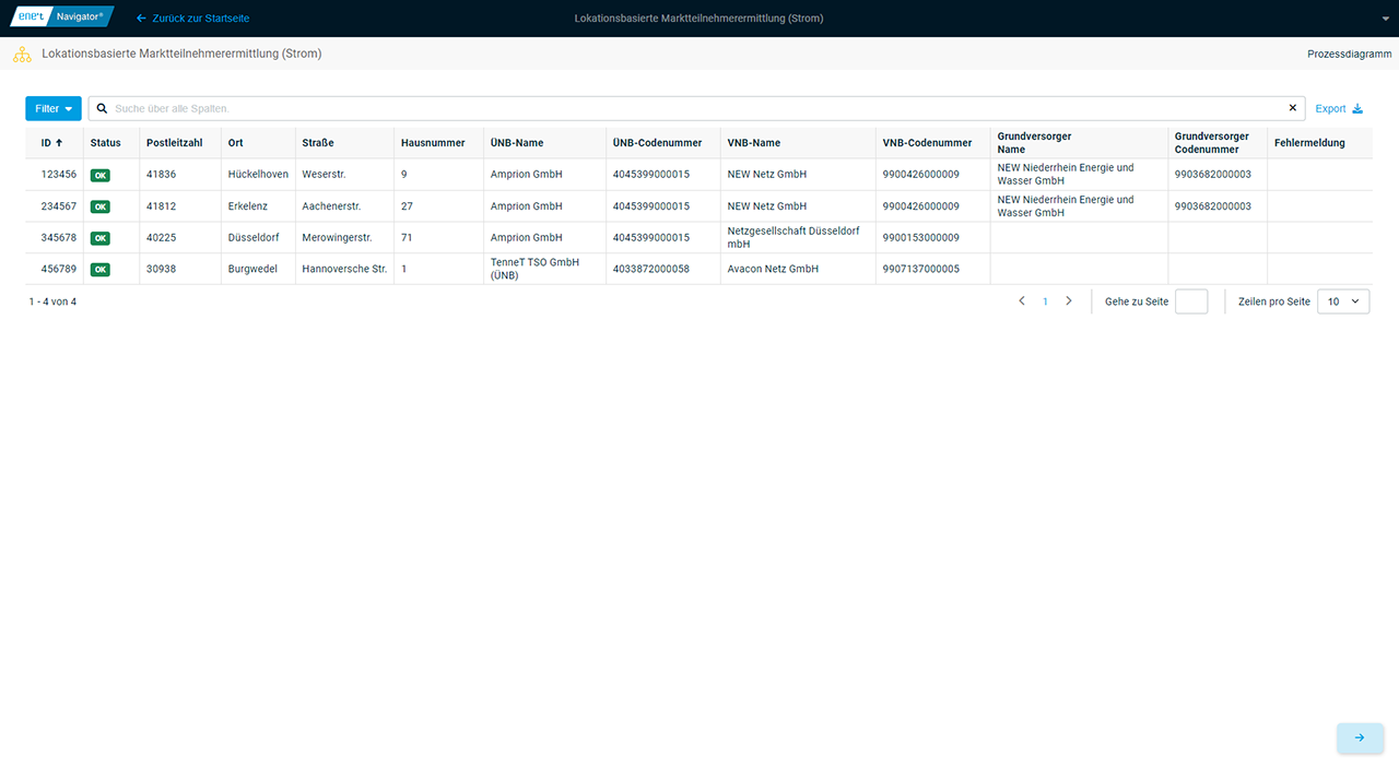 Soll­ten über­ge­be­ne Adres­sen feh­ler­haft sein, so dass kei­ne ein­deu­ti­ge Ermitt­lung des Markt­teil­neh­mers mög­lich ist, wird inner­halb der Tabel­le zur ent­spre­chen­den Markt­lo­ka­ti­on eine ent­spre­chen­de Feh­ler­mel­dung aus­ge­ge­ben. Die­se Mel­dun­gen wer­den auch im Export aus­ge­ge­ben. Durch die optio­nal buch­ba­re App Adress­kor­rek­tur kön­nen sämt­li­che Adress­da­ten vor­ab geprüft und im Bedarfs­fall kor­ri­giert werden.