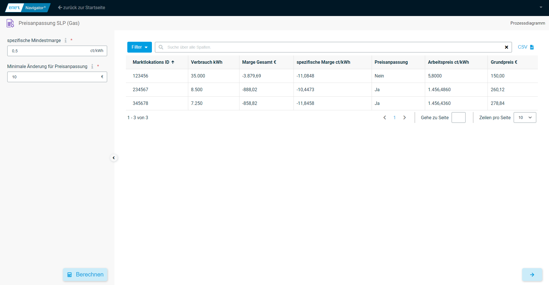 Nach der Eingabe wird angezeigt, bei welchen der importierten Lokationen eine Preisanpassung erforderlich ist und welche neuen Preise dafür kalkuliert wurden. Falls die Preise angepasst werden müssen, wird der im Laufe des Prozesses mit der App Regionale Angebotskalkulation (Gas) neu berechnete Tarif der jeweiligen Lieferstelle zugeordnet. Nach der Berechnung wird eine Tabelle mit den folgenden Parametern ausgegeben: