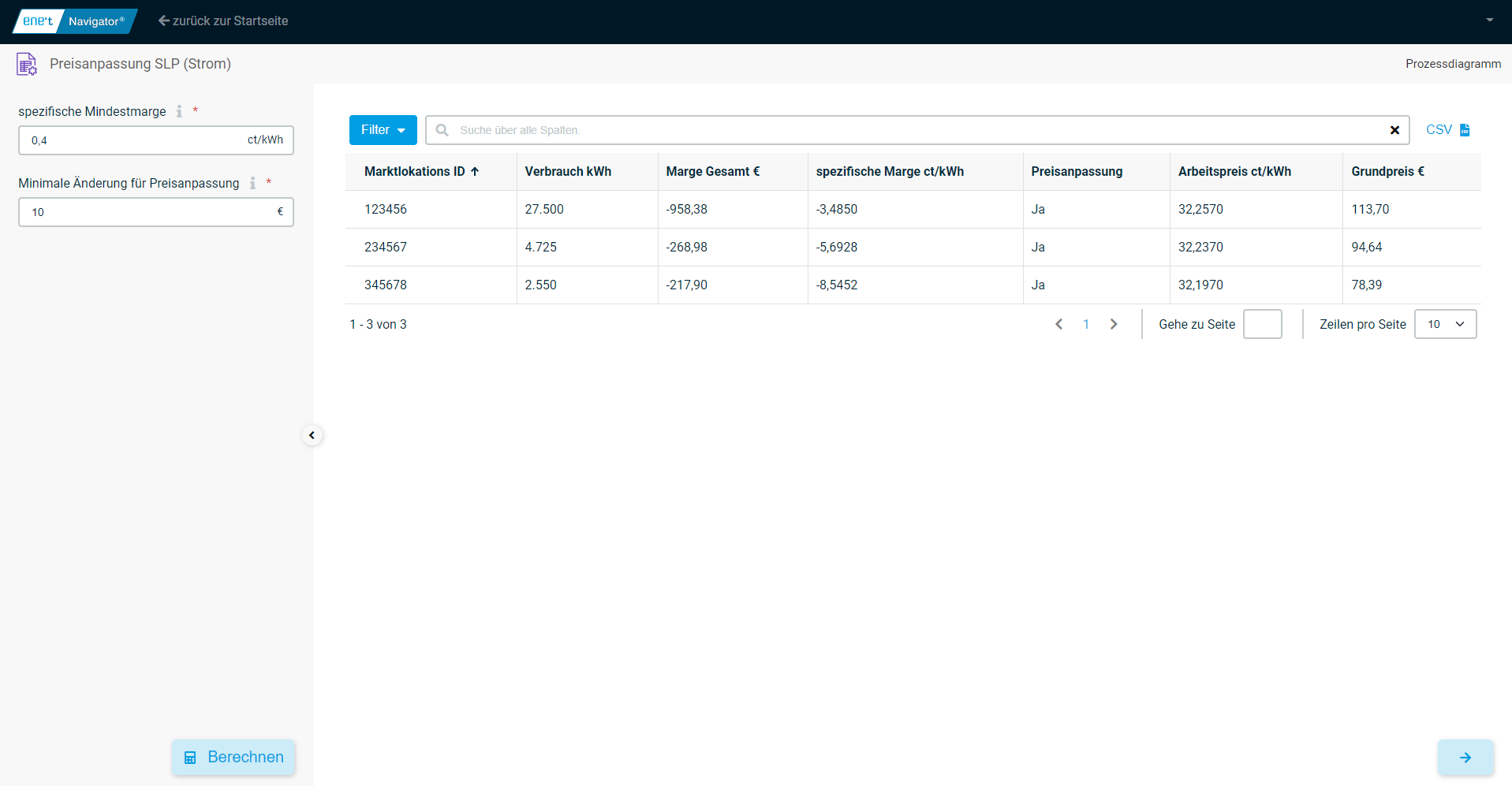 Nach der Ein­ga­be wird ange­zeigt, bei wel­chen der impor­tier­ten Loka­tio­nen eine Preis­an­pas­sung erfor­der­lich ist und wel­che neu­en Prei­se dafür kal­ku­liert wur­den. Falls die Prei­se ange­passt wer­den müs­sen, wird der im Lau­fe des Pro­zes­ses mit der App Regio­na­len Ange­bots­kal­ku­la­ti­on (Strom) neu berech­ne­te Tarif der jewei­li­gen Lie­fer­stel­le zuge­ord­net. Nach der Berech­nung wird eine Tabel­le mit den fol­gen­den Para­me­tern ausgegeben: