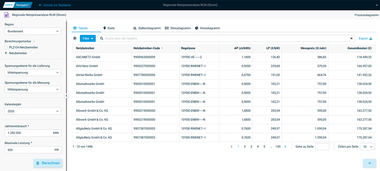 Die Regionale Netzpreisanalyse RLM (Strom) gibt Ihnen Antworten auf diese Fragen und bereitet die Informationen zudem auch optisch in Form von Diagrammen und einer Karte auf. Mit Hilfe der App haben Sie das ideale Werkzeug, um regionale Vergleiche zu ziehen, die Ihnen z.B. bei der Suche nach neuen (Filial-) Standorten helfen können.